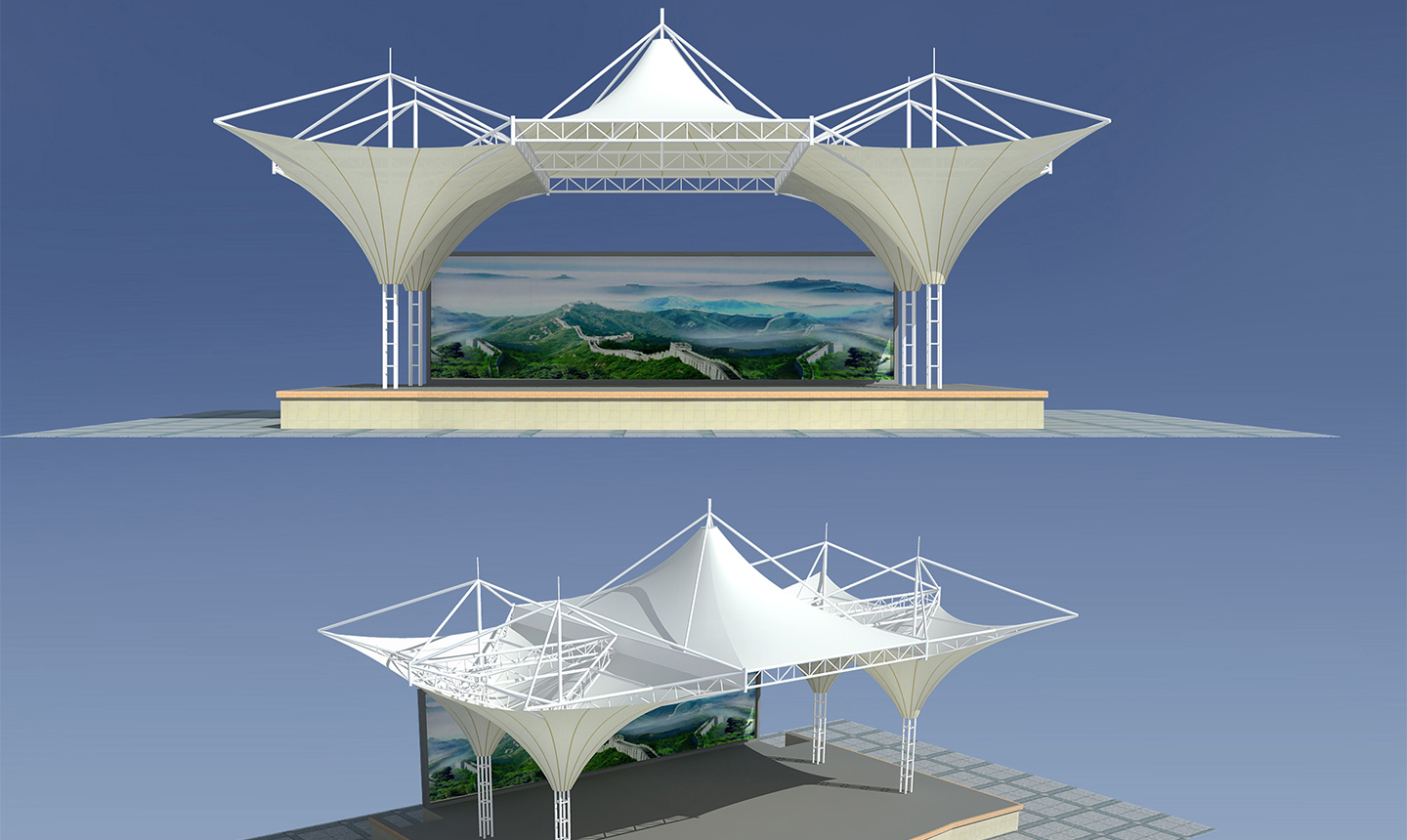 1、舞臺張拉膜結構的共同曲面外形使其具有激烈的雕塑感,膜面經過張力到達自平衡。