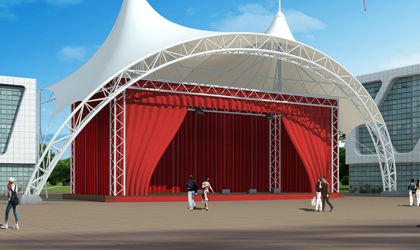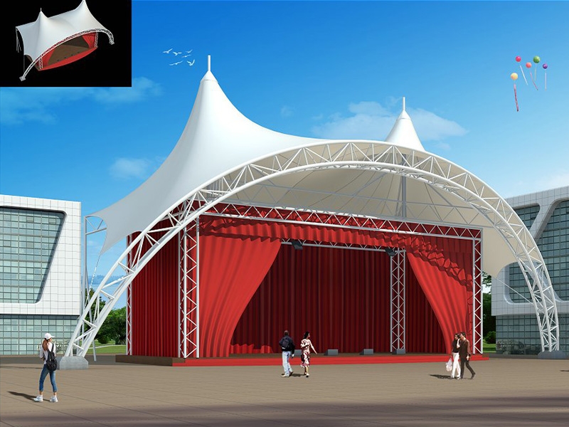 1、舞臺(tái)張拉膜結(jié)構(gòu)的共同曲面外形使其具有激烈的雕塑感,膜面經(jīng)過張力到達(dá)自平衡。