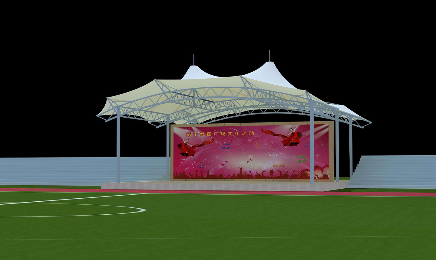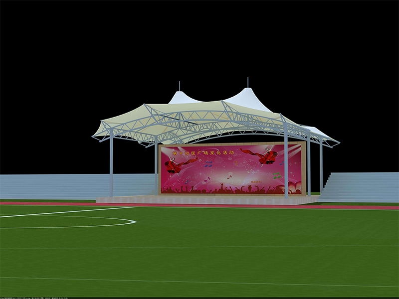 1、舞臺張拉膜結構的共同曲面外形使其具有激烈的雕塑感,膜面經過張力到達自平衡。