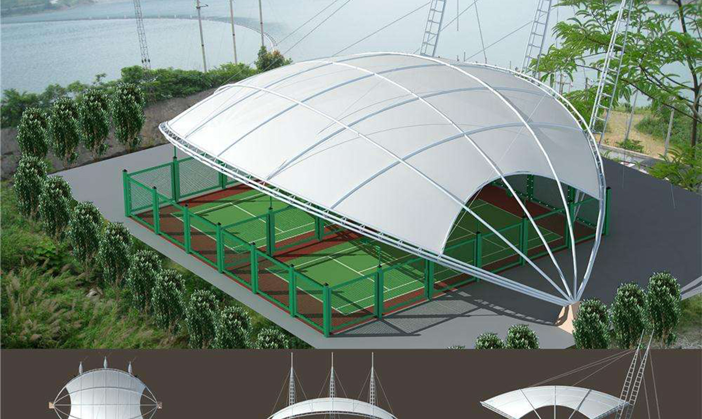 一、對于場地要求低,基本上所有球場地都可以做膜結構頂棚,相比混凝土結構的風雨球館,施工周期短,造價低。