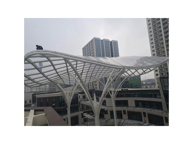 “ETFE”是英文Ethylene Tetra Fluoro Ethylene的縮寫,中文名稱為乙烯-四氟乙烯共聚物。ETFE膜材具有較高的抗拉強度、抗沖擊強度及抗撕裂能力。ETFE膜材的厚度通常在0.05~0.25mm。隨著厚度的增加,膜材的硬度將增加,同時也更脆,增大了加工難度。ETFE材料的典型用法是,將兩層或三層膜材“焊接”在一起,運送到工地,然后充氣使它們膨脹成氣枕。